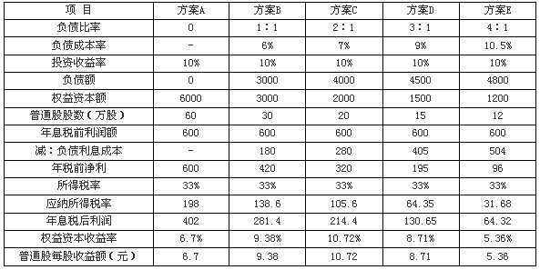 融资决策是每个企业都会面临的问题,也是企业生存和发展的关键问题之一。融资决策需要考虑众多因素,税收因素是其中之一。利用不同融资方式、融资条件对税收的影响,精心设计企业融资项目,以实现企业税后利润或者股东收益最大化,是税收筹划的任务和目的。我们先举一个简单的例子来说明融资决策中税收筹划的重要性。案例1:某公司计划投资100万元生产一种新产品,在专业人员的指导下,制定了三个方案。假设公司的资本结构如下表所示,三个方案的债务利率均为10%,企业所得税税率为33%.那么,其权益资本投资利润率如下表所示: