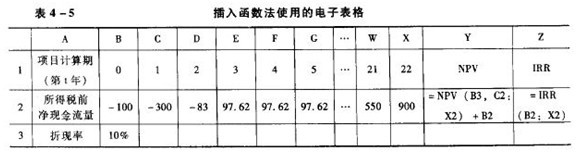 将表4-1中的全部所得税前净现金流量数据输入EXCEL电子表格,结果见表4-5中的第二行B2~X2单元格[2]。