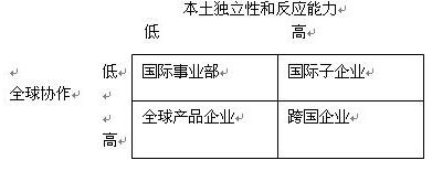 2.国际子企业。国际子企业以地理位置为基础并在各国家内独立经营。在这些企业中,基本上所有的管理职能都以国家为基础,从而实现高度的本土反应能力。母企业的控制权可能依赖于计划体系和报告体系,并且母企业可能对国际战略拥有最终否决权,但全球协作水平可能比较低。
