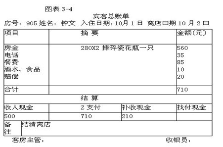 (3)宾客账单(图表3-2)。宾客账单由前台收银员根据房间卡片等资料,按每一宾客设置。宾客账单每天按宾客消费项目和价款及时登记和结算。