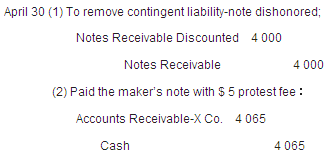 When the maker of a discounted note receivable pays the note at maturity, the discounting party (endorser) may then remove the note receivable amount and the contingent liability contra amount in Notes Receivable Discounted from its accounts. If the maker of a note receivable fails to pay it (dishonors it)at maturity, the bank will notify the endorsing party and charge the full amount owed, including interest, to the bank account of the endorser. In addition, the bank may also charge a small fee called a protest fee. Two entries would be made by the endorser: